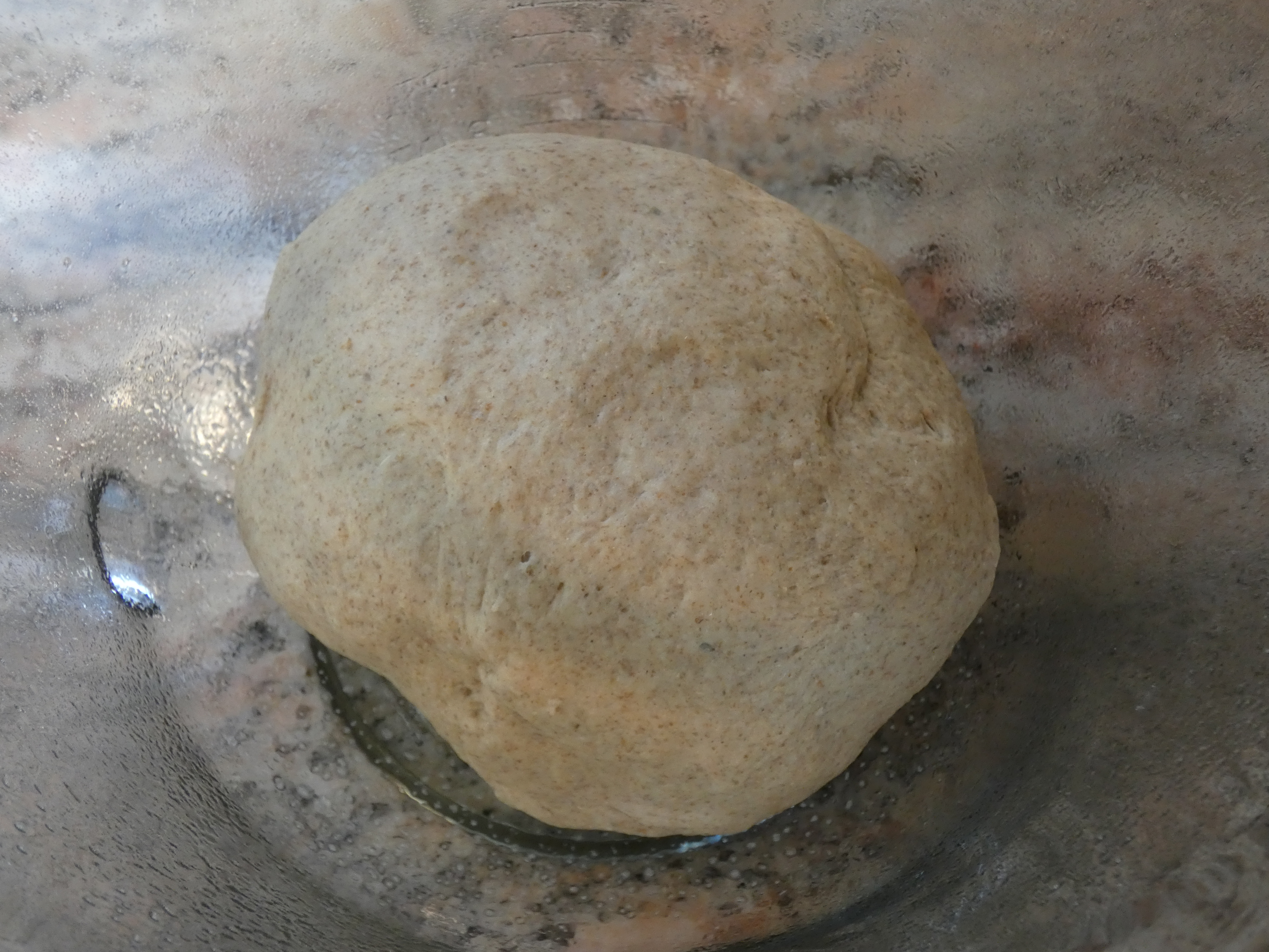 - When the dough is sufficiently kneaded, form it into a ball, place it in your rise receptacle, cover with plastic wrap, and let rise for about an hour until it doubles in size.