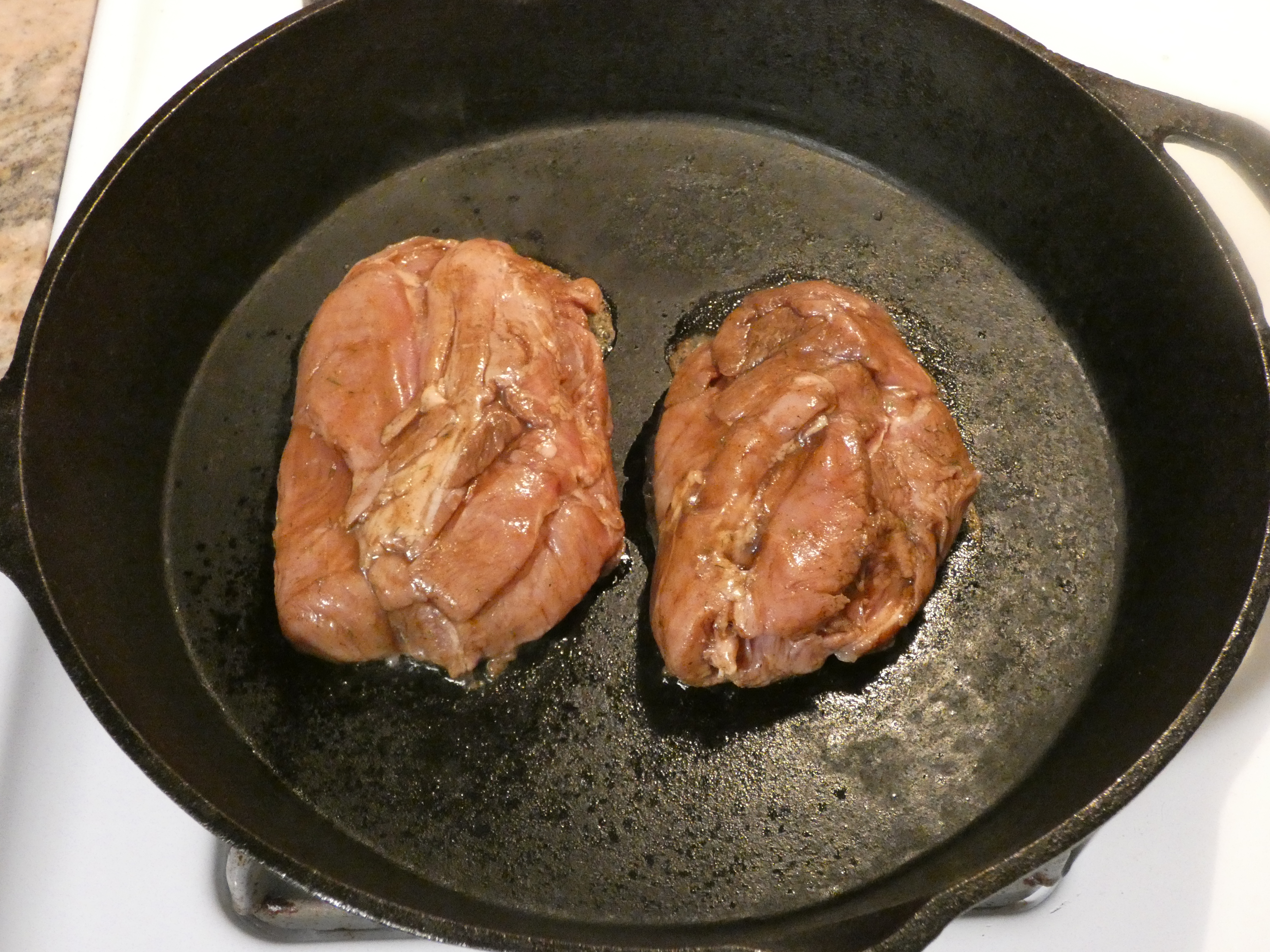 - Heat a cast iron skillet with a little olive oil, and when it gets hot, place your turkey thigh pieces in.