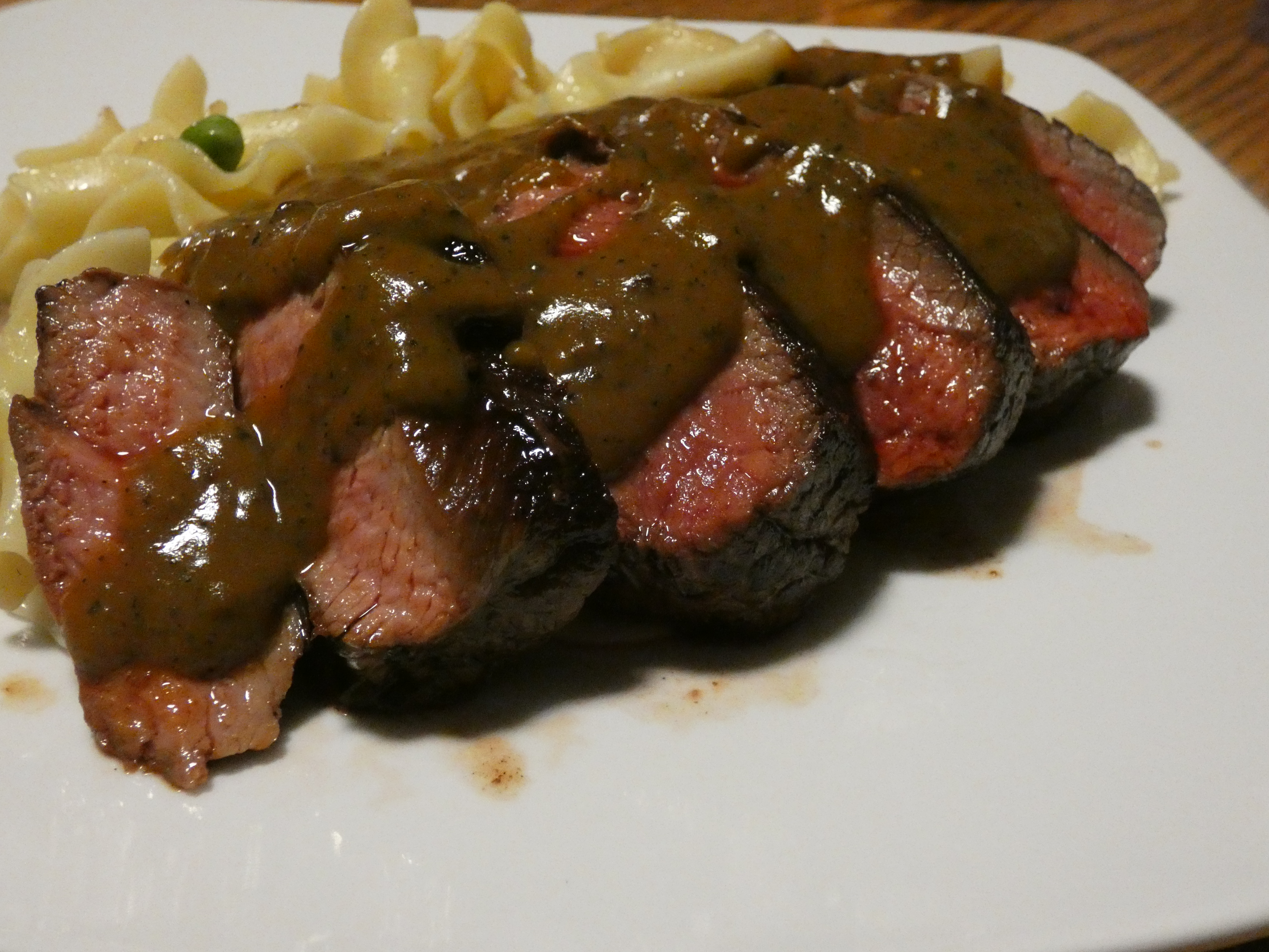 - As your sauce finishes, slice your steak against the grains.