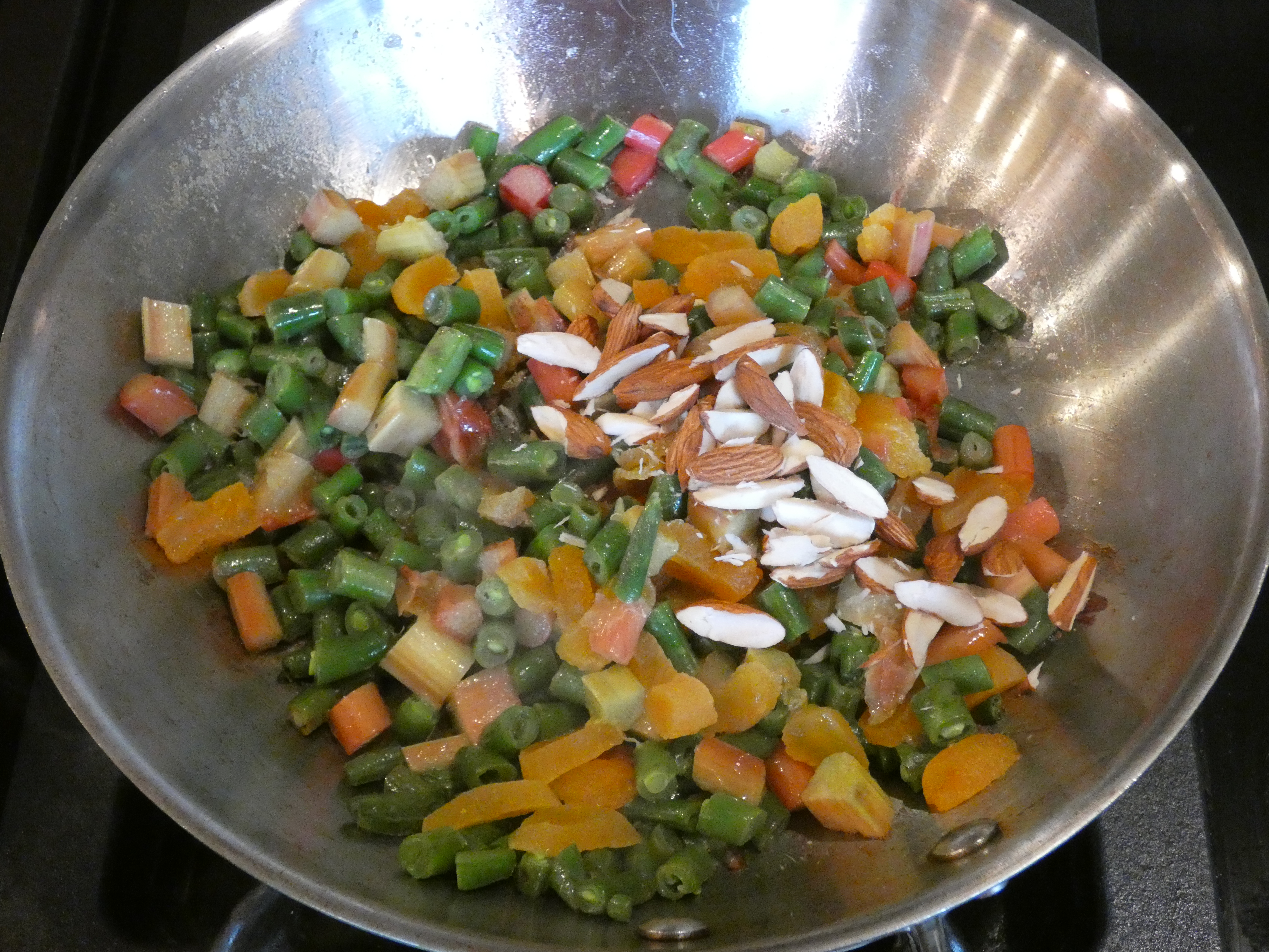 - Sautee until the rhubarb starts to soften and “dissipate.” Then, slice and add your apricots and almonds, and sautee for a little while longer. Add more butter and/or water as needed.