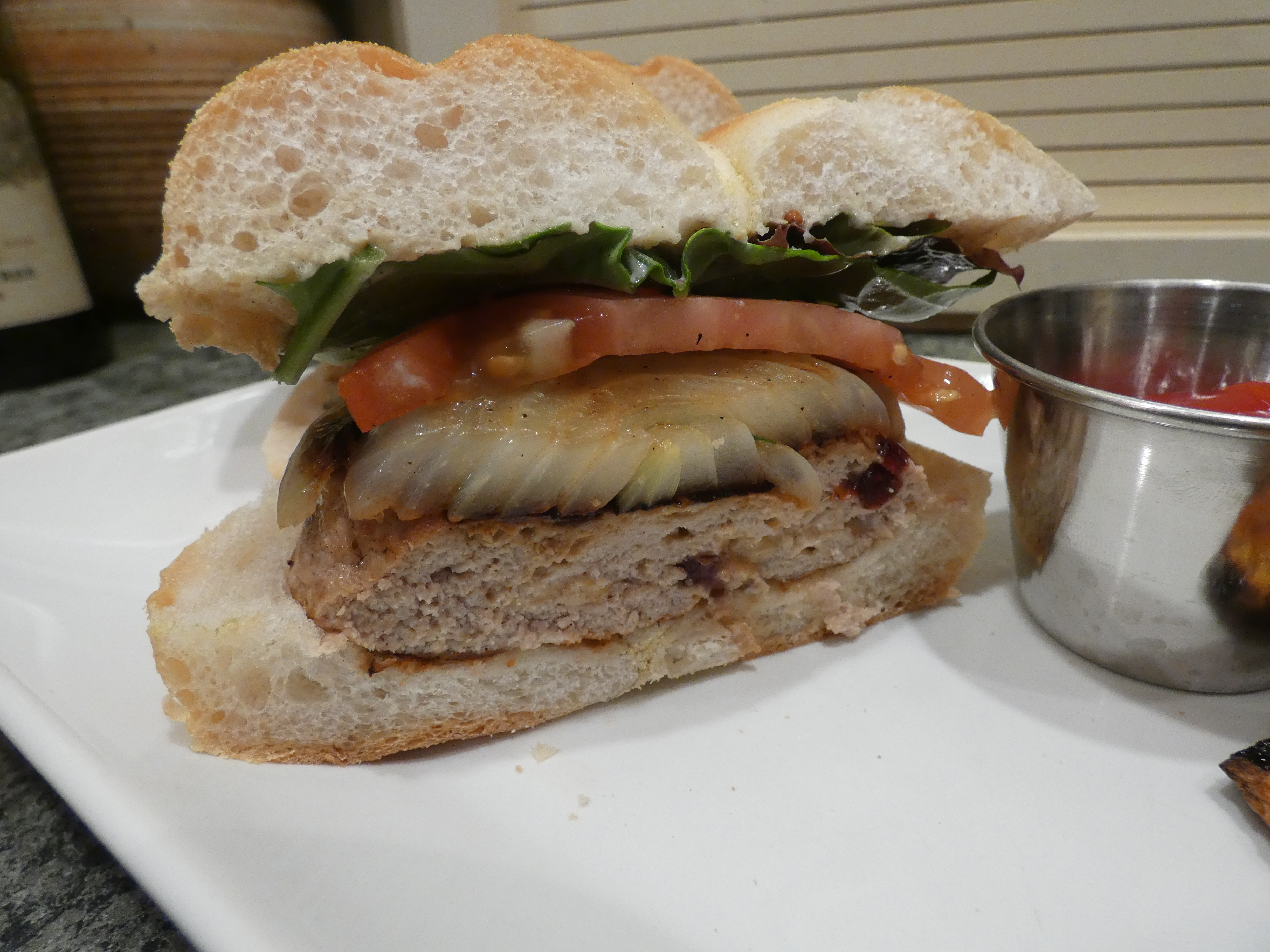 Before I go into the little blurb, I realize that the bun I selected was WAY too big for the burger. This was a fresh kaiser roll, and we used 4 oz of ground turkey per burger. You want to either go with an 8 oz burger or a smaller bun.